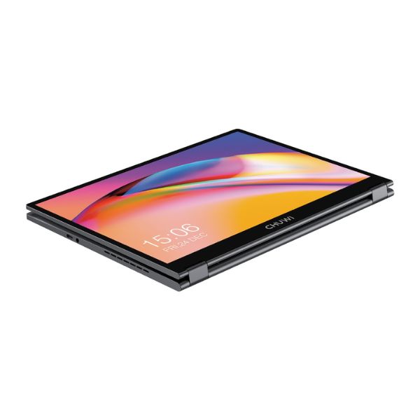 Color gris (Iron Gray). Diseño moderno, construido en aluminio y plástico, con formato convertible 360° para usarse como notebook o tablet.